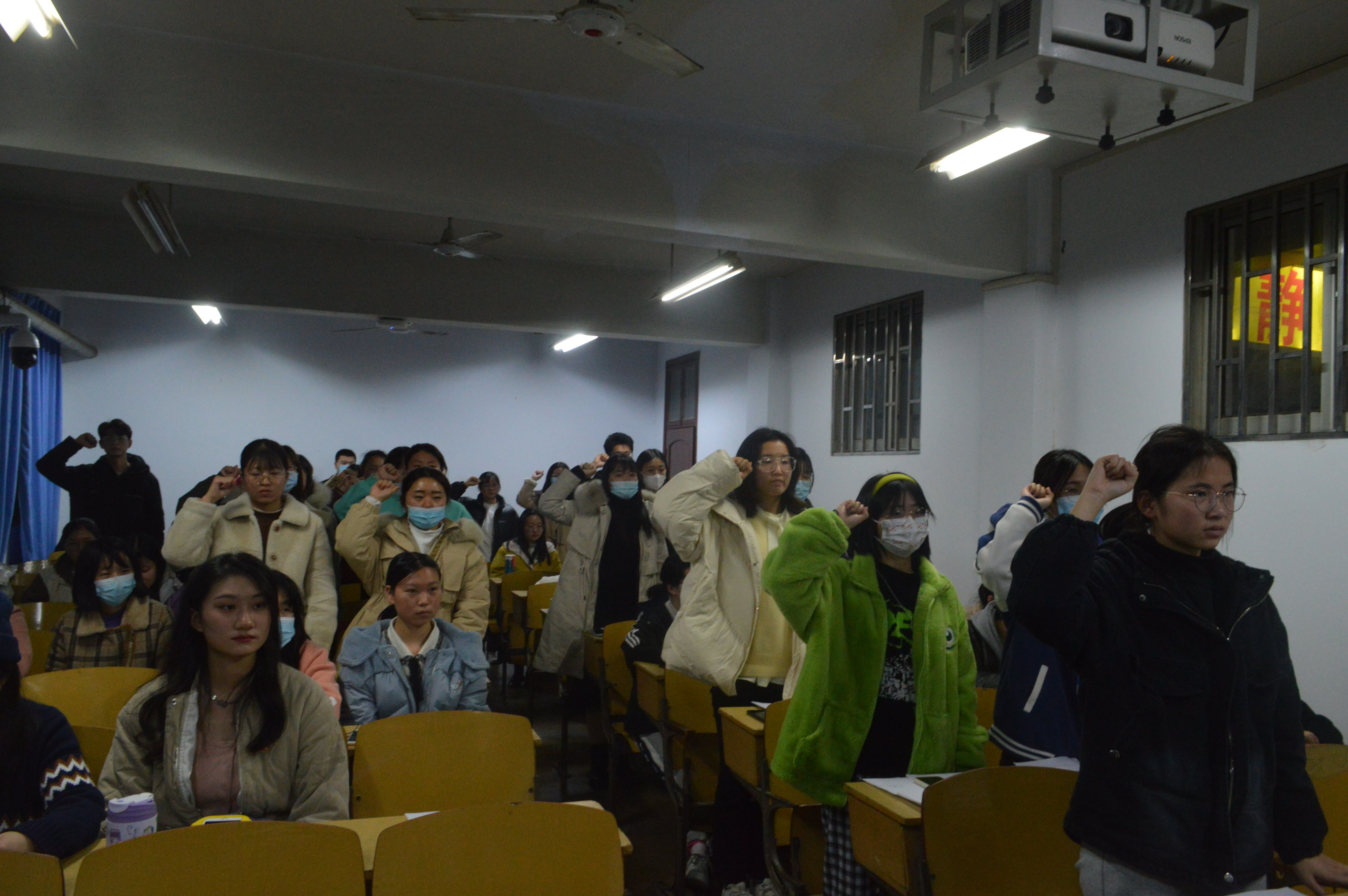 会议严格按照党组织所规定的预备党员接收及预备党员转正的程序进行。大会开始,各发展对象们逐一宣读《入党志愿书》,并向党组织汇报自身对党的认识、入党动机、个人经历以及在校表现等,随后由各支部组织委员及宣传委员介绍各自发展对象主要政治思想、学习、工作生活等情况,并向大会报告其现实表现的考察以及综合政治审查情况,与会党员对发展对象是否符合党员条件发表了意见。大会认为,李宏扬等11名同志基本符合党员条件,经与会正式党员举手投票表决,大会一致同意接收李宏扬等11名同志成为中共预备党员。会议宣布后,预备党员同志们分别面对党旗进行庄严宣誓,也向大会表达了自身的想法与决心。