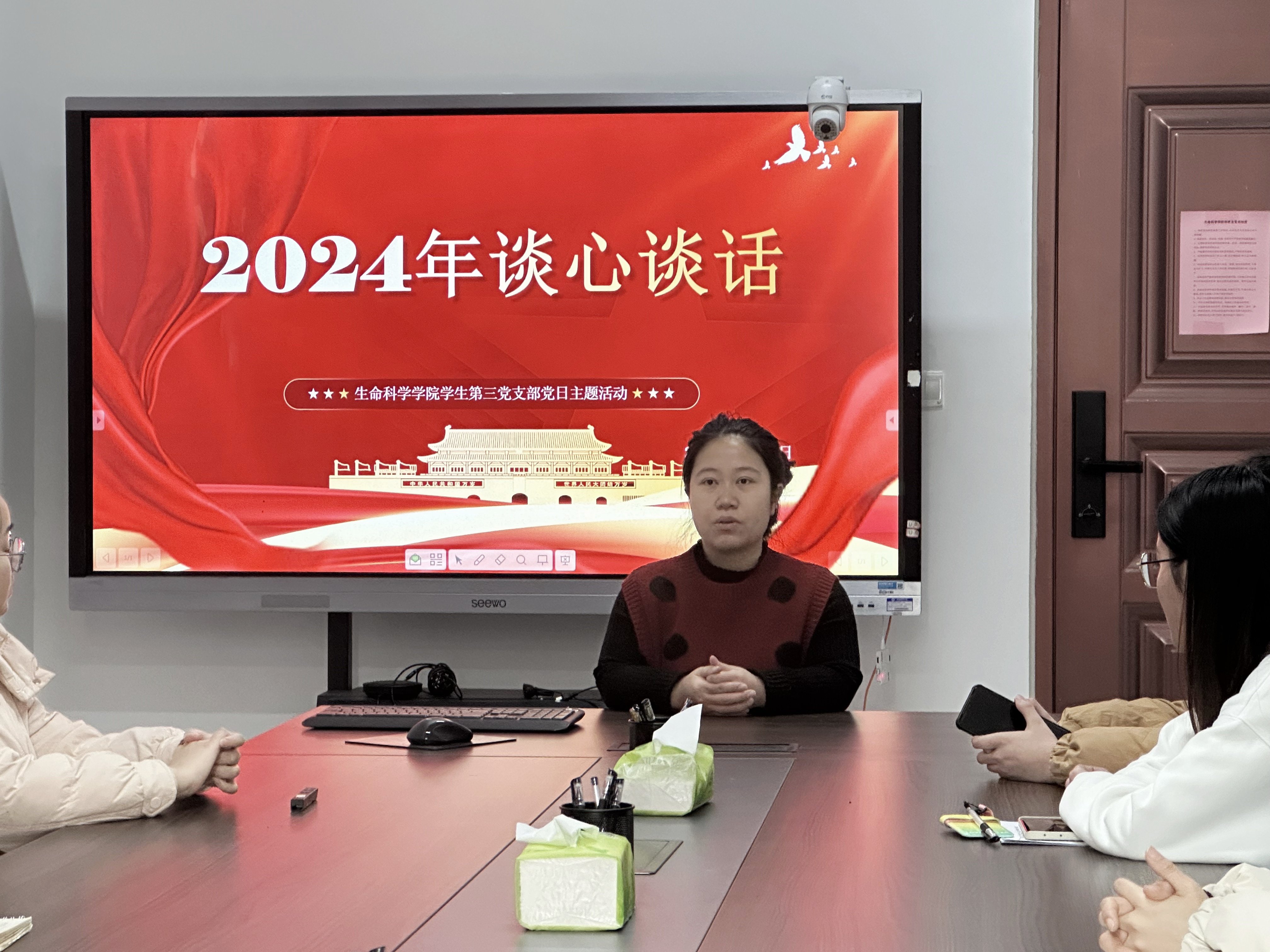 学生第三党支部着重于党员间的谈心谈话。支部书记张晶为党员们送去了新年祝福,并对本年度的学习和支部建设工作进行了总结与回顾。在此次谈心谈话活动中,党员们敞开心扉,围绕本支部工作成绩、存在不足和思想感悟等方面分享了这一年在组织生活中的成长收获,也对新一年的到来表达了期许、设立了目标。会议室内党员们热情交流,共同回顾了这一年在组织中所创造的难忘回忆,更增进了彼此间的沟通与团结。