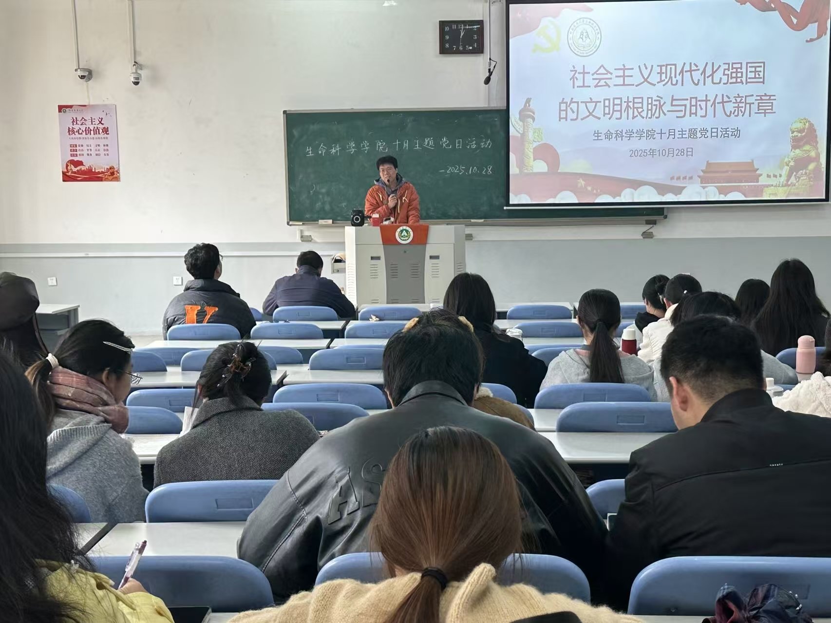 首先,徐奥老师以郑州德化街今昔对比切入,通过昔日战火疮痍与如今繁华景象的鲜明反差,阐释“伟大复兴是让人民安心逐梦”的核心内涵。党课紧扣三大主线:从文明基因解码民族复兴的历史逻辑,以“五位一体”“四个全面”为纲,结合比亚迪创新突破、文化IP“出圈”、雾霾治理成效等案例,将战略转化为发展图景;聚焦青年担当,通过重温入党誓词、回溯抗疫党员逆行事迹,阐明“觉悟”是初心、“担当”是行动。他强调,民族复兴是先辈热血铺就、当代人实干推进的征程,每一项成就都镌刻着共产党人的奋斗。整场党课以历史照见现实、用案例诠释理论,激励青年党员以实干担当书写新时代的“复兴答卷”。