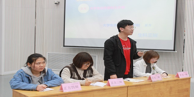 此次决赛共有6位评委,详细的评分机制、公开的答辩环境,为辩手搭建了一个平等、公正的对话平台。辩论赛以大学生做兼职、谈恋爱、普及手机的利弊等贴近大学生生活的话题为辩题,引导学生树立正确的价值观。决赛赛程分陈述己方观点、攻辩、自由辩论、结辩四个环节,赛中,双方辩手围绕主题旁征博引,斗反应、斗口才、斗知识,激起了观众阵阵掌声。尤其是攻辩阶段,双方辩手充分发挥个人优势特点,深入分析论证己方论点,洞察对方论证中的薄弱环节,针锋相对,激烈辩驳,不时迸发启发性的观点,展现出大学生的理性与思考,散发着青春的光芒。经过激烈角逐,生物科学三班以更密切的团队协作摘得桂冠,生物科学三班孟露阳同学获得最佳辩手。赛后,同学们表示在辩论场上进行语言的交锋和思想的碰撞是一次难得的机会、丰富的历练和视听盛宴。