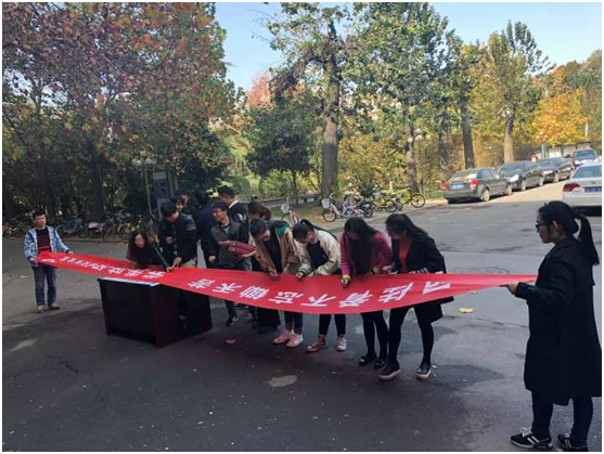 这次签名活动,意在倡议大家积极投身到“文明餐桌”活动中,宣传文明餐桌知识,推广文明餐桌礼仪,倡导节约用餐行为、从文明餐桌的细节入手,切实做到:节俭用餐——不剩饭剩菜,吃多少点多少;安全用餐——不用地沟油,不用变质食品;健康用餐——讲究营养,合理搭配菜品;礼貌用餐——礼让他人,遵守用餐秩序;卫生用餐——爱护用餐环境,不用一次性筷子,努力营造“文明用餐”的良好社会风气。在接下来的签名活动中,学院老师、同学们踊跃地在“品佳肴不忘锄禾苦,尝美味切忌奢靡风”的横幅上庄地签下自己的名字,以此形式作出郑重承诺。