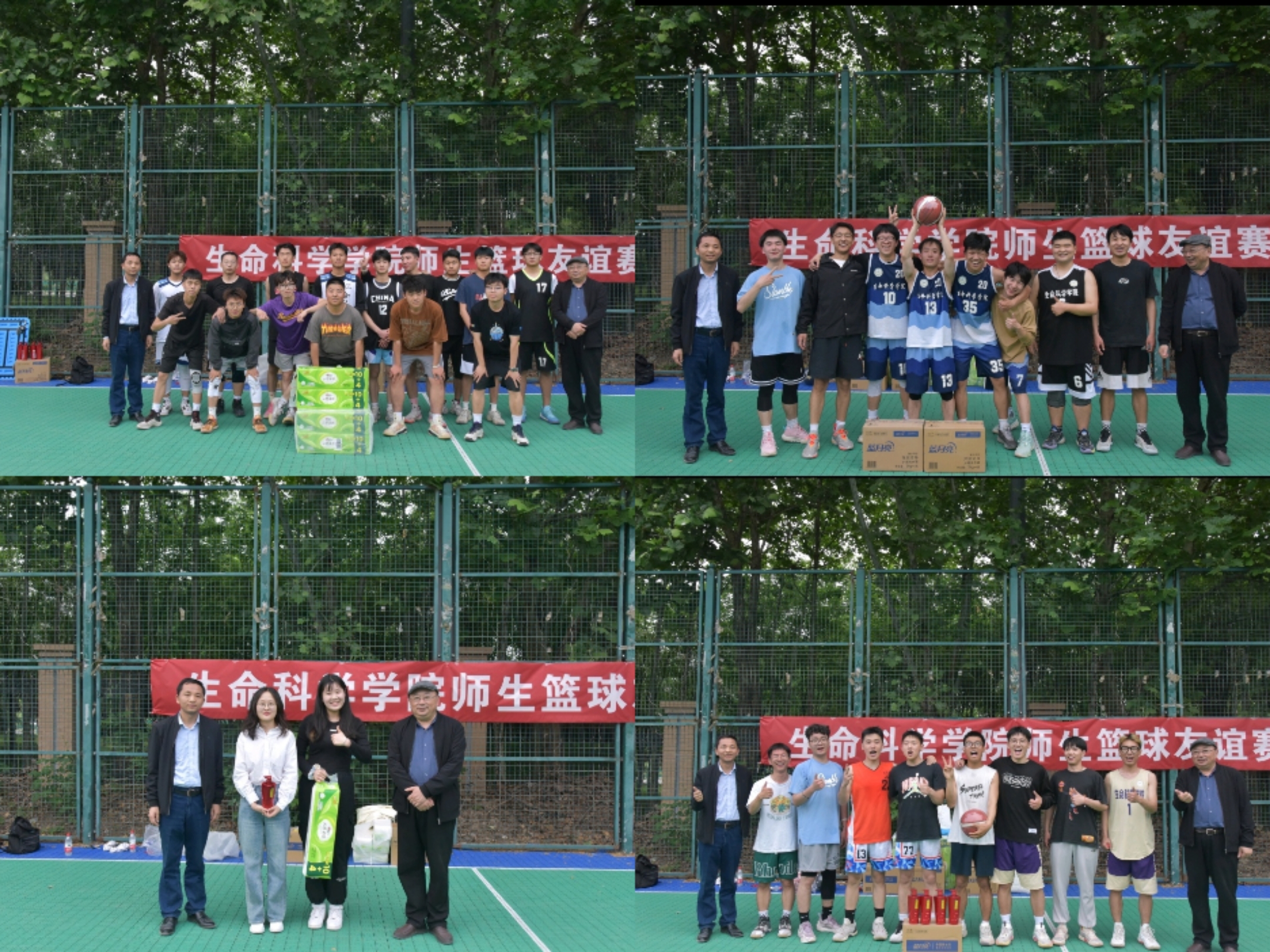 本次比赛秉承“友谊第一,比赛第二”的原则,以趣味运动赛和5V5正赛两种形式进行。赛场上,学生代表队通过积极的拼抢、防守反击,凭借精准的投篮和完美的三分球不断取分。教师代表队则稳扎稳打,利用娴熟的球技、默契的配合以及严密的防守不断取分。比赛过程精彩不断,赢得了场边观众的阵阵掌声。比赛结束后,老师们为各支获奖队伍颁发奖品并合影留念。