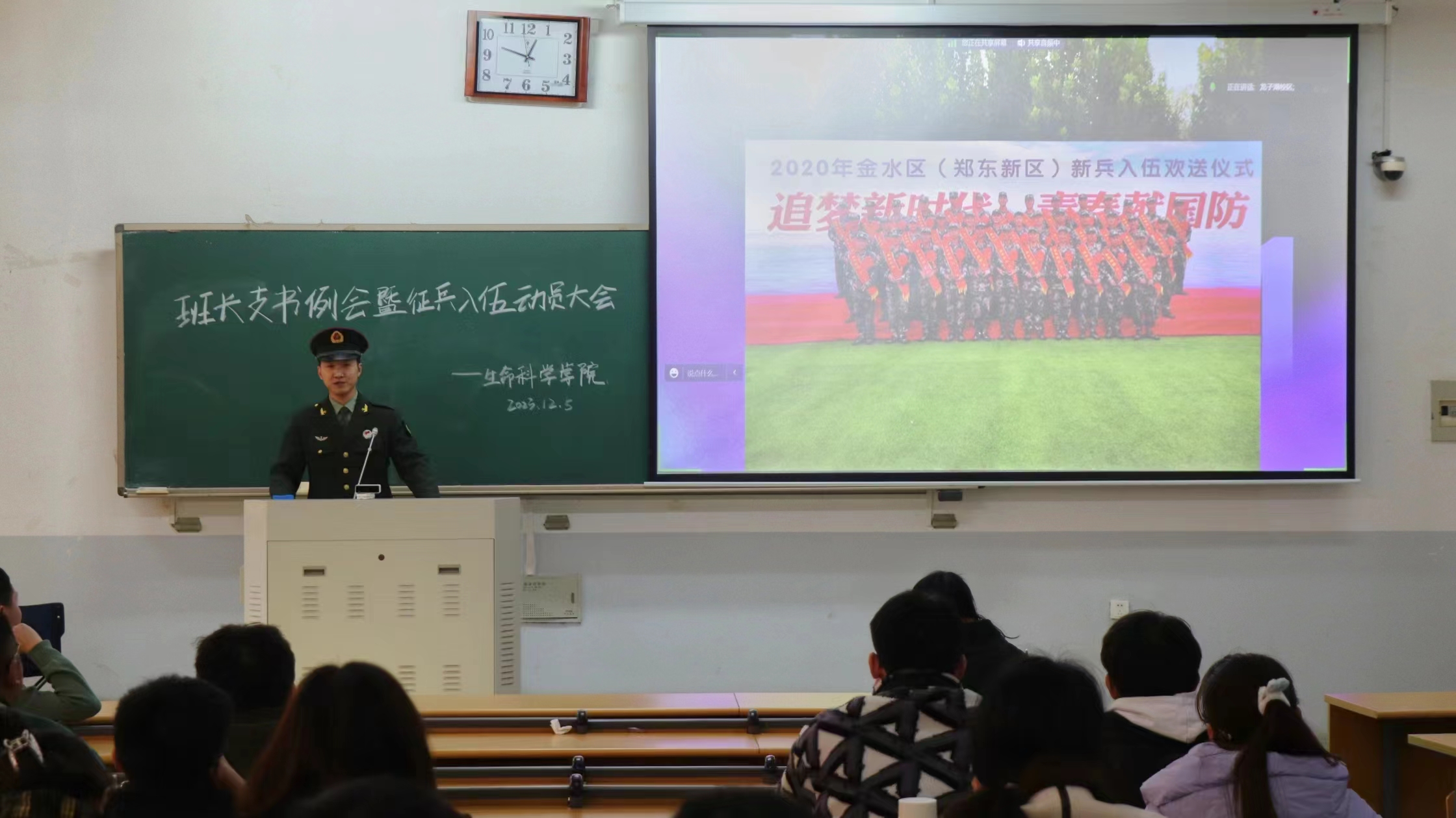 会议伊始,张琨首先播放征兵宣传视频,激发参会同学参军热情。随后从高校学生优先政策、部队成长发展、经济补助、退伍复学待遇报名时间方式和报名条件等方面进行详细讲解,张琨希望同学们将征兵入伍作为一个提升自我的桥梁,将个人理想与富国强军相结合,将个人青春风采融入祖国发展,积极响应国家征兵入伍的号召,投身国防建设的伟大事业。同时,要求学生干部高度重视,及时在班级内部开展征兵入伍动员班会。最后,a小说 22级退伍复学学生高天结合自身真实情况向同学们分享参军经历,寄语准备参军入伍的同学,一个没有经历过军旅生涯的人,永远不会真正明白人生的价值,鼓励同学们投笔从戎,将青春热血洒在祖国大地上。
