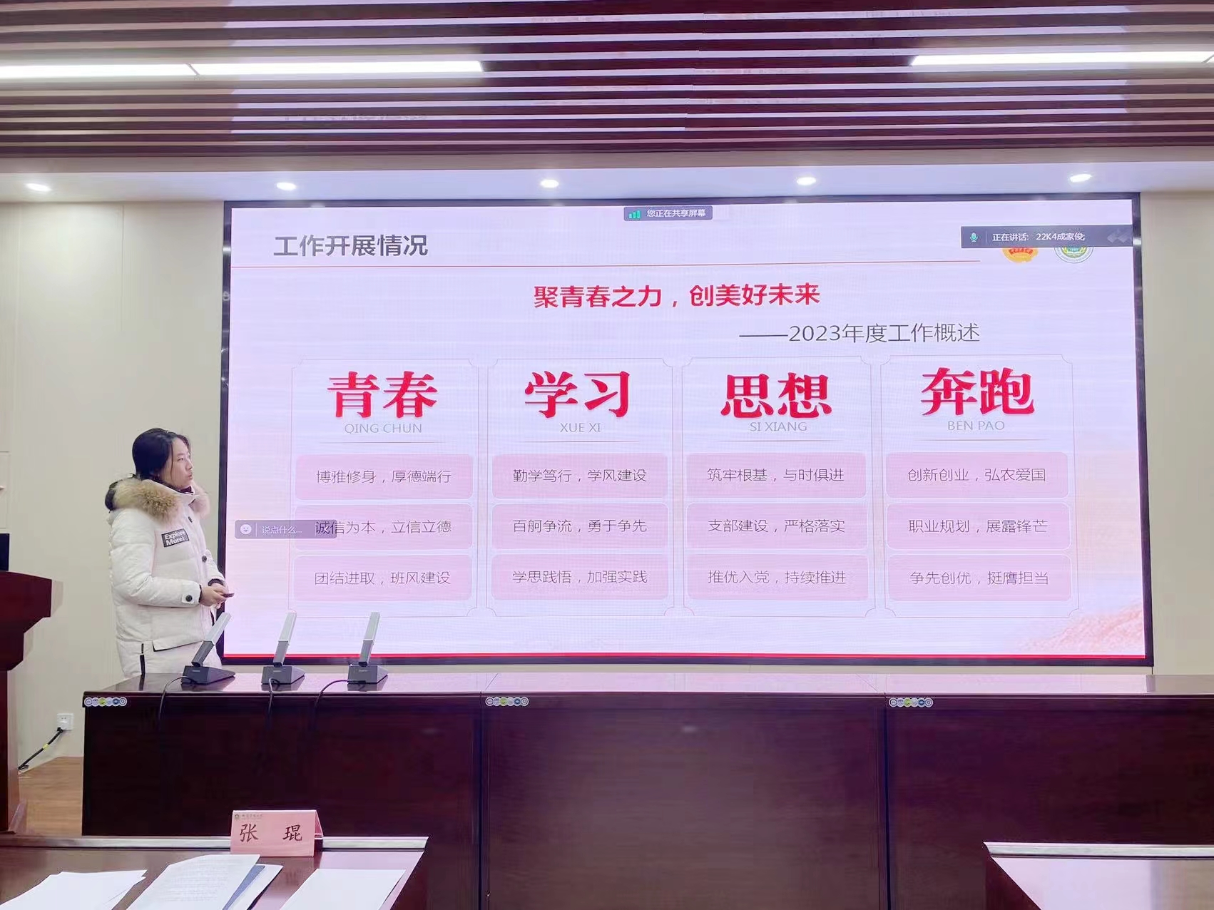 各团支部书记围绕2023年度团组织工作要点,结合团员和青年主题教育,分别从思想引领、组织建设、校园文化、社会实践、志愿服务等方面详细汇报了本年度的工作职责落实情况和工作成果,并交流了工作期间的心得感悟,充分展现了各团支部积极向上的精神风貌。同时,团支部书记们结合支部实际情况分析目前工作中存在的不足,并进一步对未来工作做出展望。