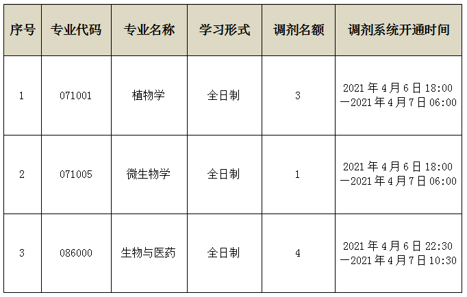 根据目前招录情况,a小说 植物学、微生物学、生物与医药专业调剂系统开通安排如下,请符合条件的考生积极报名。