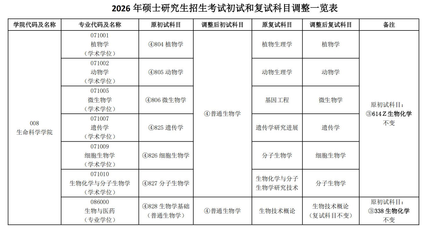 相关专业2026年硕士研究生招生考试初试和复试科目调整如下: