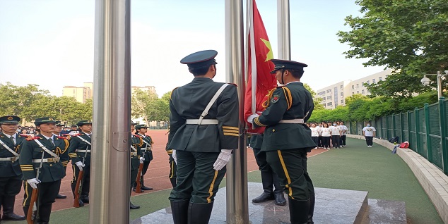 上午七点,清晨的田径场上,师生们整齐的身影沐浴着曙晖。伴着嘹亮的口号,在全院师生的注视下,国旗护卫队队员昂首挺胸,护卫着国旗,精神饱满地向升旗台走来。在雄壮的国歌声中,鲜艳的五星红旗迎着朝阳冉冉升起,全院师生齐唱国歌,向国旗行注目礼,表达对祖国无限的热爱和崇高的敬意。