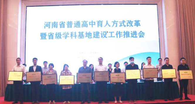 河南省普通高中学生发展基地和实践基地相关负责人代表上台接受授牌