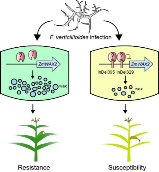 该研究利用全基因组关联分析鉴定到两个显著的SNP与拟轮枝镰孢菌种腐病显著相关,这两个位点位于一个植物表皮蜡质合成相关基因(ZmWAX2)区间内。过量表达ZmWAX2能够明显增加玉米叶片及种子表皮蜡质含量,从而显著提高转基因玉米对拟轮枝镰孢菌导致的种腐、苗枯及茎腐病抗性。相反,ZmWAX2功能缺失则会显著减少表皮蜡质含量、降低玉米对拟轮枝镰孢菌种腐、苗枯、茎腐病的抗性。在感染拟轮枝镰孢菌茎腐病时,过表达ZmWAX2的转基因玉米与非转基因对照相比,籽粒产量显著增加,同时种子内部拟轮枝镰孢菌侵染量显著降低。研究还发现在玉米遗传群体中ZmWAX2基因启动子区存在自然变异,其中两个7 -bp的DNA小片段缺失会增加ZmWAX2的表达,从而导致对拟轮枝镰孢菌产生抗性。