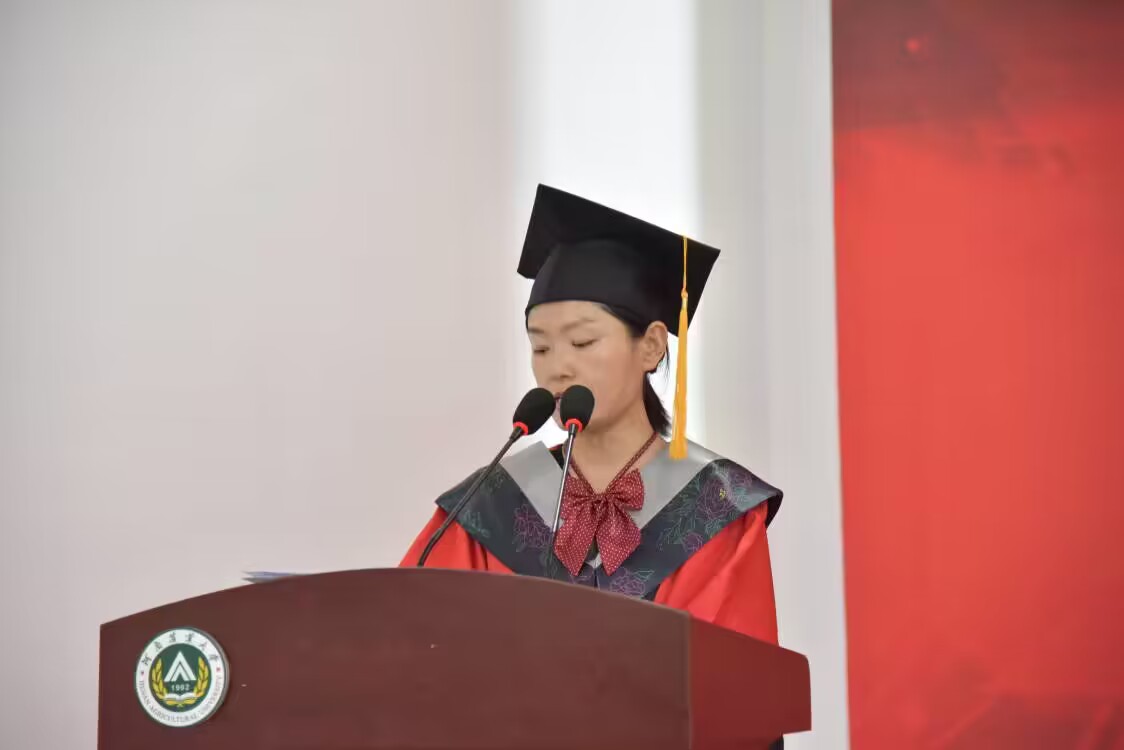毕业研究生代表刘子豪同学发言,在农大学习生活的经历始终是他一生最可宝贵的财富和不竭的动力源泉,激励着他在平凡中坚守初心、砥砺奋进。他希望毕业生们坚持梦想、不忘初心,注重细节、精益求精,勇挑重担、心怀家国。历经坎坷,耐得住平凡寂寞,收获成功,亦能够永葆初心。最后他号召全体毕业生:“让我们相约下一个十年、二十年校庆再相见时,以优异的成绩骄傲地向母校报告!”