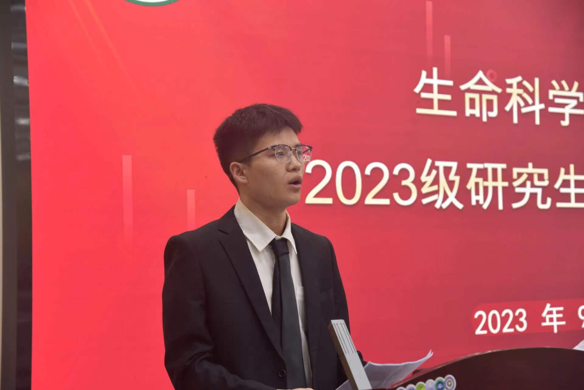 2022级研究生冯雅君分享了一年的研究生生活带给他的感悟与经验。2023级新生代表张正秒畅谈了以后的学业规划,表示要志存高远,自主创新,树牢科学意识,遵守科学道德。