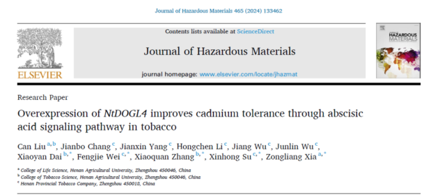 在先前研究中,我们通过转录组分析鉴定到一个响应镉胁迫的DOGL基因(NtDOGL4)。本研究利用转基因技术获得过表达NtDOGL4的烟草转基因材料,对该材料进行Cd胁迫处理,发现其内源性ABA水平升高,Cd积累减少和Cd耐受性增强,同时活性氧(ROS)积累减少。进一步,通过酵母单杂交、荧光素酶报告系统和瞬时表达实验,鉴定到一个调控NtDOGL4表达的上游转录因子ABSCISIC ACID-INSENSITIVE 5(ABI5),发现ABI5可以直接结合NtDOGL4的启动子,促进其表达。值得注意的是,NtDOGL4过表达促进烟草根部木栓质的形成和沉积,同时抑制烟草根中Cd转运基因的表达。综上所述,NtABI5-NtDOGL4分子模块在烟草对Cd胁迫耐受性中起到了正调节作用,该研究为培育低Cd积累的作物新品种提供了重要的分子靶点和基因资源,在确保环境和农业生产安全方面具有潜在的应用价值。