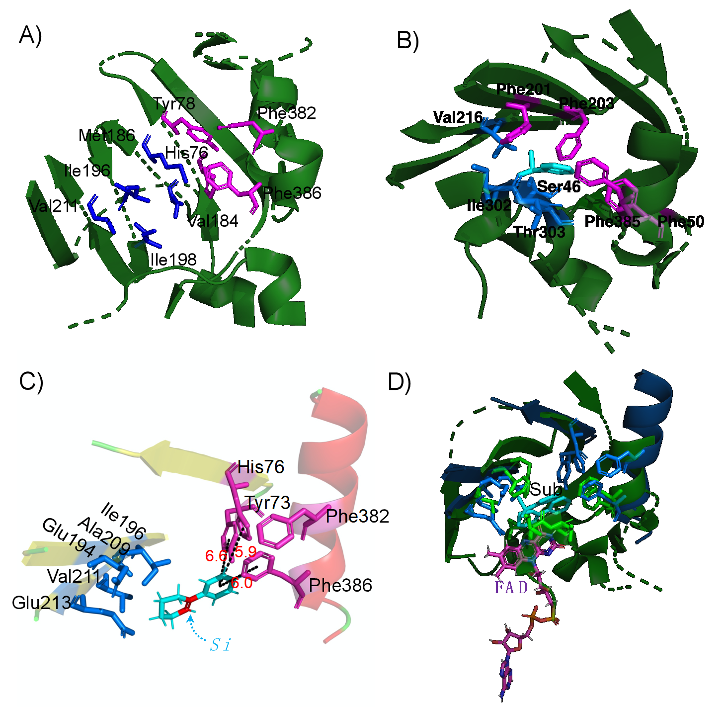 经过一系列的突变分析,确定73位和211位氨基酸残基的芳香性/疏水性决定了底物的结合方位,从而决定SMO催化的立体选择性。73位和211位氨基酸残基的芳香性/疏水性的转变,实现突变体酶催化环氧化由(S)-立体选择性转变为(R)-立体选择性。分子对接分析也显示相关位点的突变导致底物在酶中的结合方式发生翻转,进而导致酶的立体选择性发生反转。