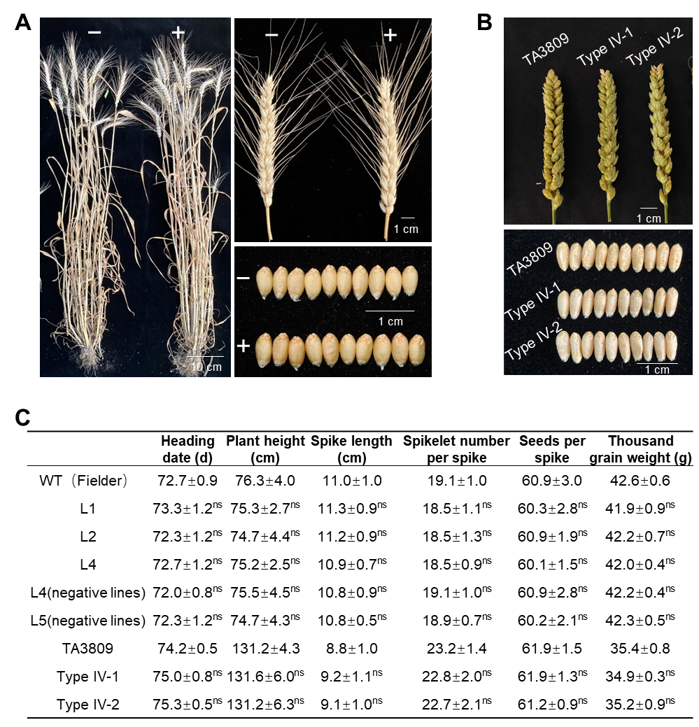 图2. Pm57小片段易位系和转基因系的产量性状评估