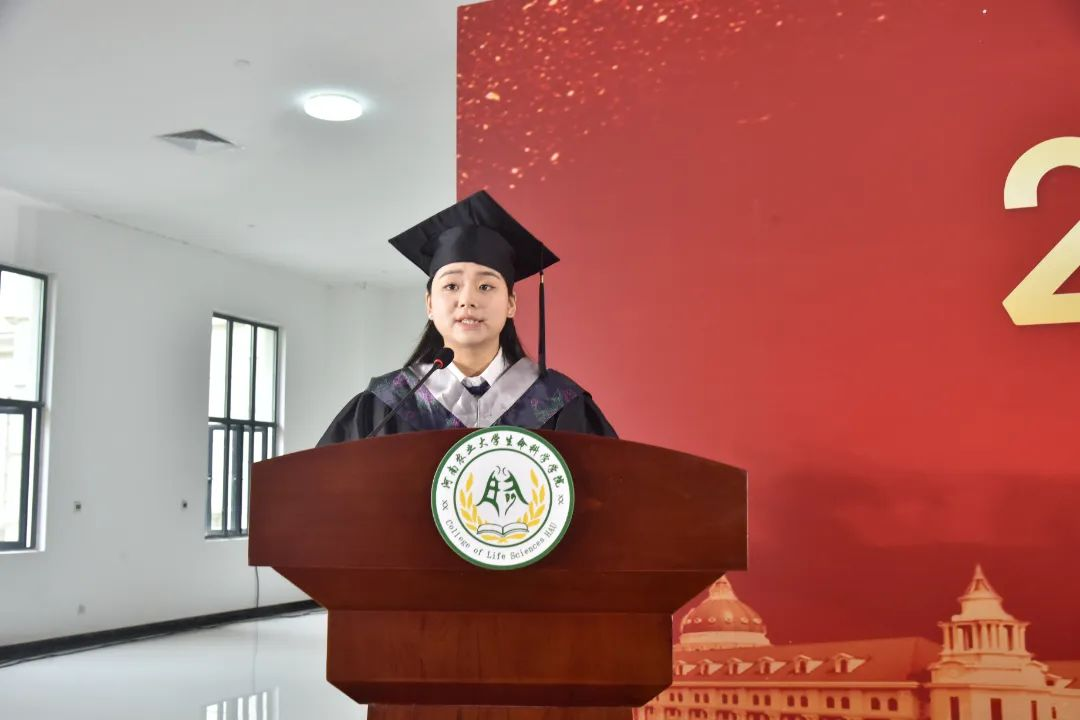 本科生代表冯孟可同学以小麦生长的“萌芽”“拔节”“抽穗”三个阶段为主线,深情回顾了在农大的成长历程,她号召同学们带着学院赋予的勇气与智慧,在人生的新征途上践行属于农大人的使命与担当,在人生的舞台上绽放属于自己的万丈光芒。