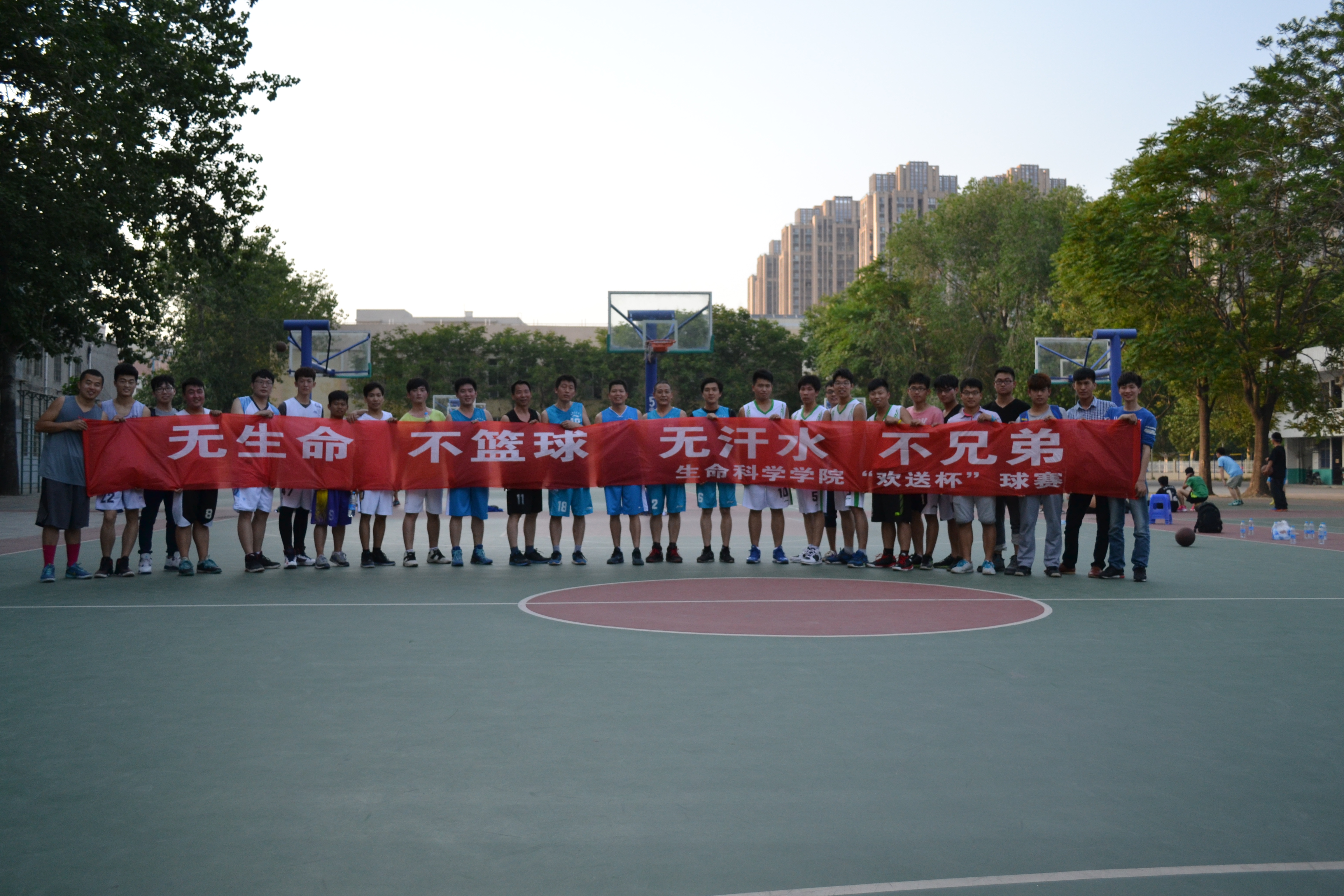 研究生代表队和教职工代表队。球赛本着“友谊第一,比赛第二”的原则和“无生命,不篮球;无汗水,不兄弟”的口号,共进行了为期五天十二场的精彩比赛。在这十二场比赛中,参赛队员个个斗志昂扬、精神抖擞,将个人技巧发挥的淋漓尽致。队员们默契配合,攻防有序,为比赛奉献了一个又一个精彩的瞬间,博得观众的阵阵加油喝彩声。比赛中,队员们的抢球、传球、投球自然流畅,得心应手;一次次完美的配合进球、疾速的精彩抢断、默契的换位联防,充分体现着队员们“团结合作、勇于拼搏”的团队精神。整场比赛中的气氛活跃热烈,高潮迭起,博得周围同学们热烈的掌声。在这次的“欢送杯”篮球赛中,参赛队员们赛出了水平,赛出了友谊,展示了a小说