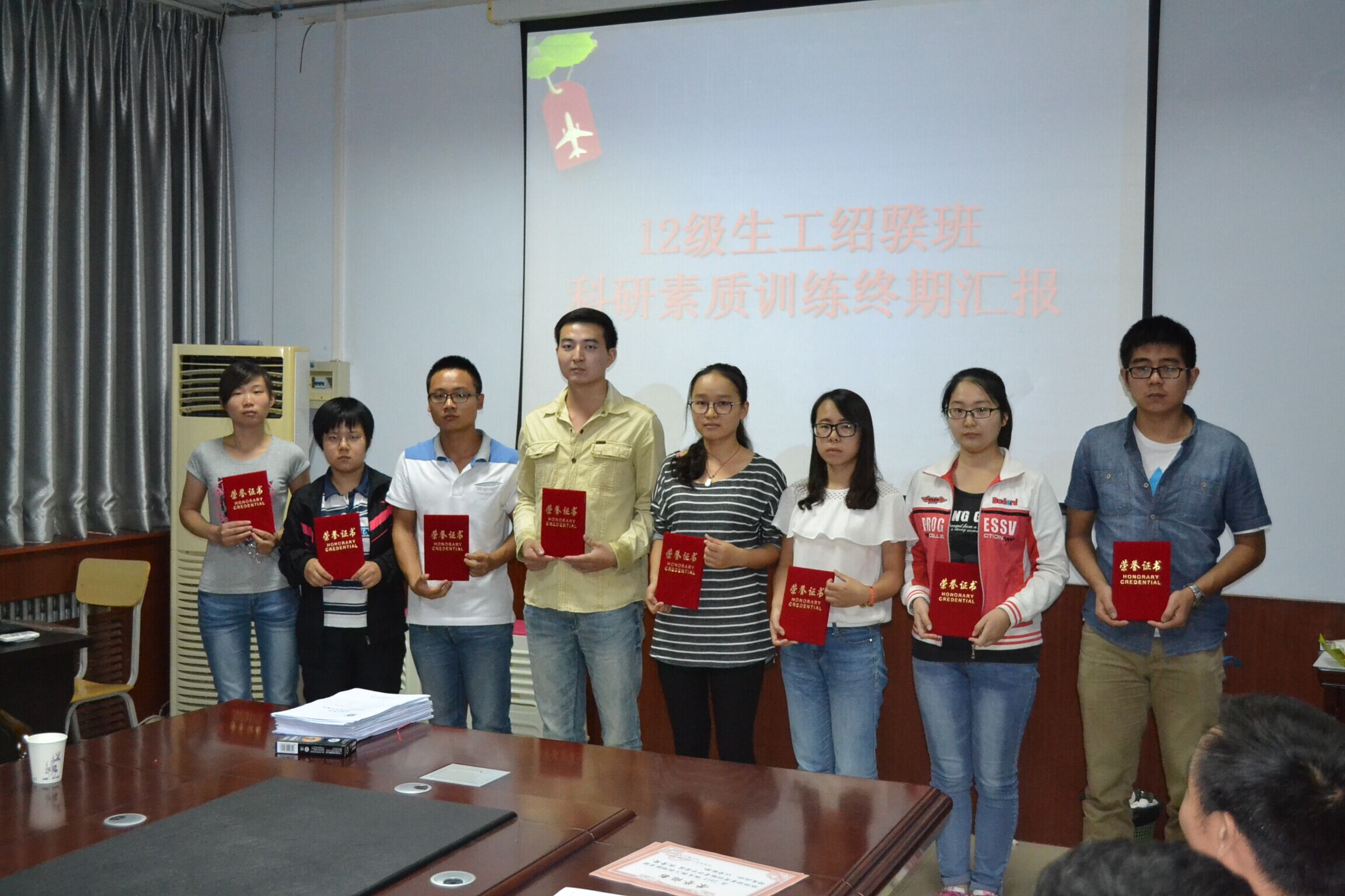 科研素质训练期终考核要求绍骙实验班学生事先填写“科研素质训练期终总结报告”,然后PPT现场汇报其参与的科研工作,评委针对学生进行的科研工作的结果及创新性、科研工作量、PPT讲述等等方面进行提问并打分。最终评出8位科研素质训练成绩优秀的同学予以表彰奖励。学院后续还将资助这些学生参加全国性学术交流会议一次。