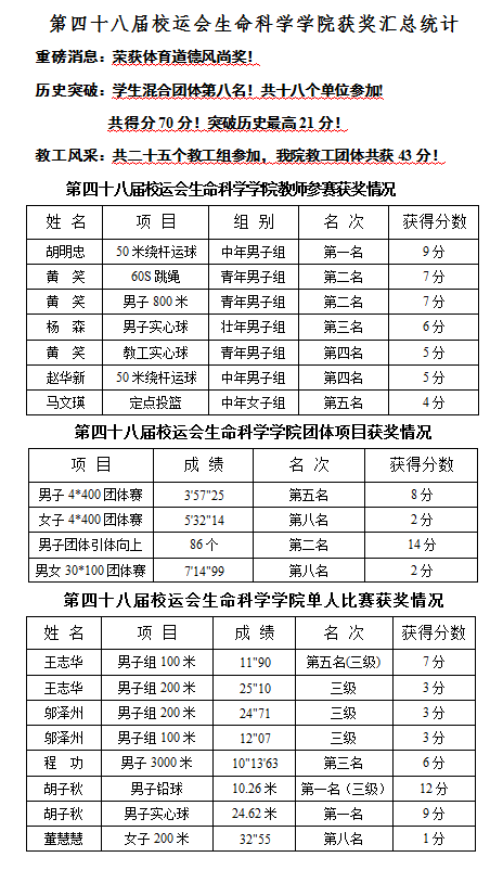 13日上午八点半,运动会在开幕式中拉开了帷幕。全校26支代表队方阵依次入场,各代表队的方阵独具特色。a小说 方阵队员迈着整齐的步伐,喊着嘹亮的口号,以绿色的树苗长成大树的队形变换彰显了a小说 的朝气蓬勃的生命特色。随后各个竞技项目有序进行,经过两天半的激烈角逐,a小说 荣获“体育道德风尚奖”,并以两枚金牌、一枚银牌、一枚铜牌的成绩荣获奖牌榜第六名。其中学生混合团体第八名,共十八个参赛单位,共得70分,突破历史最高21分,教工团体共获43分。