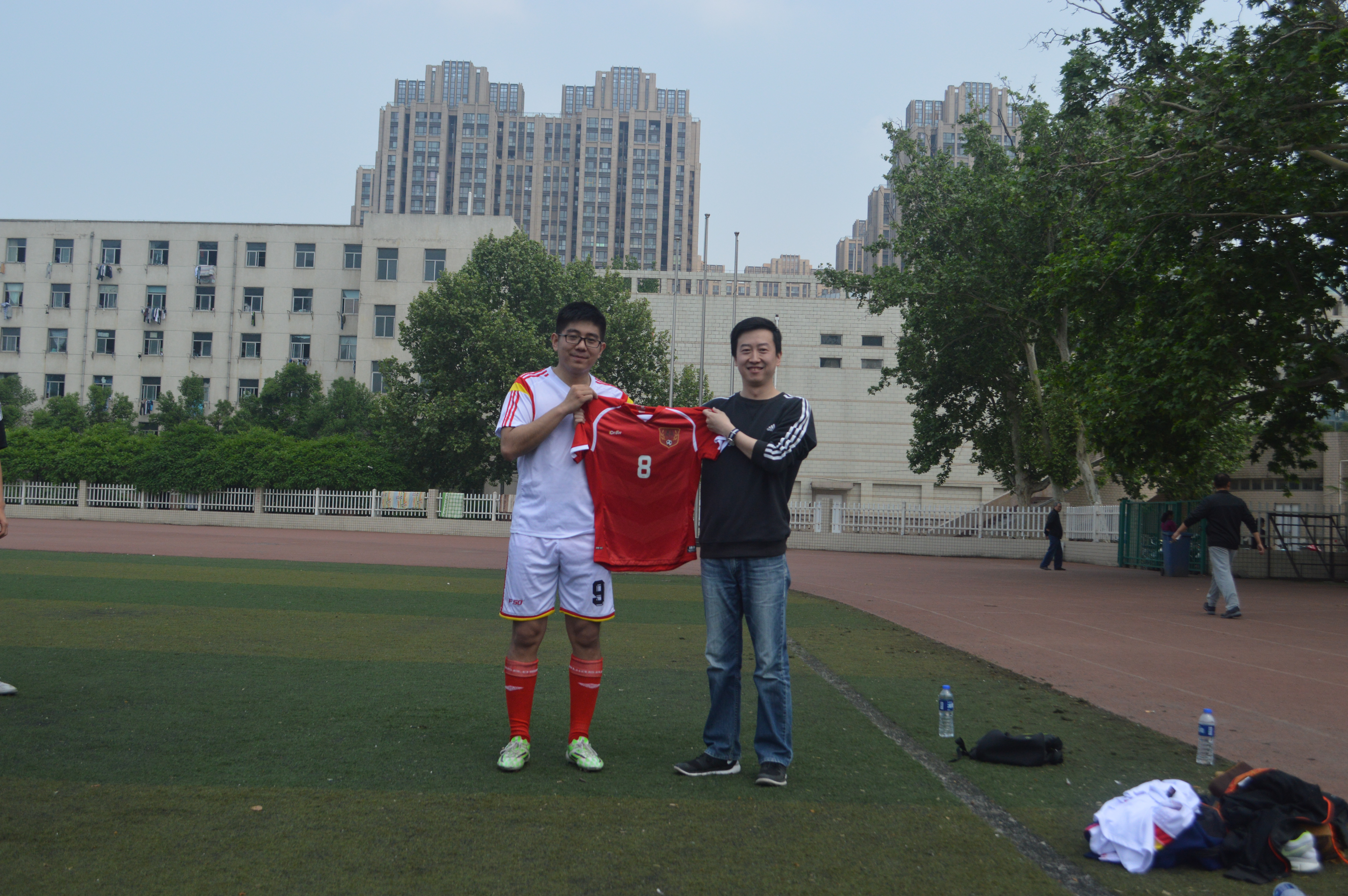 在文化路操场举办欢送毕业生足球赛,院团委书记程城到操场为所有参赛足球队员加油。
