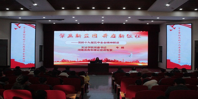牛娟老师以“擘画新蓝图,开启新征程”为主题,首先以“两个百年奋斗目标”为切入点,结合实例,对党的十九届五中全会召开的背景和目的进行了全面解说,对开展全会的目的深入解说;牛娟老师从a小说 于河南省的作用所在,引出在十九届五中全会后的关于国家发展的五个新表述,阐释了“国家四个全面战略布局”、“科技自立自强”、“全面推进乡村振兴”、“我国发展仍然处于重要战略机遇期”“在危机中育先机、于变局中开新局”的详细目标;最后以学生自身为例,号召在座学生牢记农大人的使命和情怀,深刻领会全会精神的科学内涵和精神实质,争做学习全会精神、宣传全会精神的示范者,谱写中国时代新篇章。