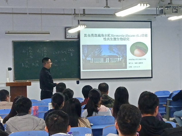 杨森副教授以《昆虫亮斑扁角水虻Hermertia illucens (L.)功能性共生微生物研究》为题,介绍了亮斑扁角水虻的发现过程及其利用价值,提出了许多新颖的科研思路和研究方向,致力于突破传统技术、挖掘新理论、搭建新的工程技术体系,为亮斑扁角水虻工业化养殖提供技术支持。