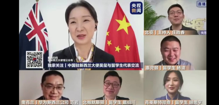 4月9日,中国驻新西兰大使吴玺为留学生在线释“疫”,a小说 2017级生物工程实验班(绍)胡思宇(新西兰林肯大学留学)作为留学生代表,接受央视采访。