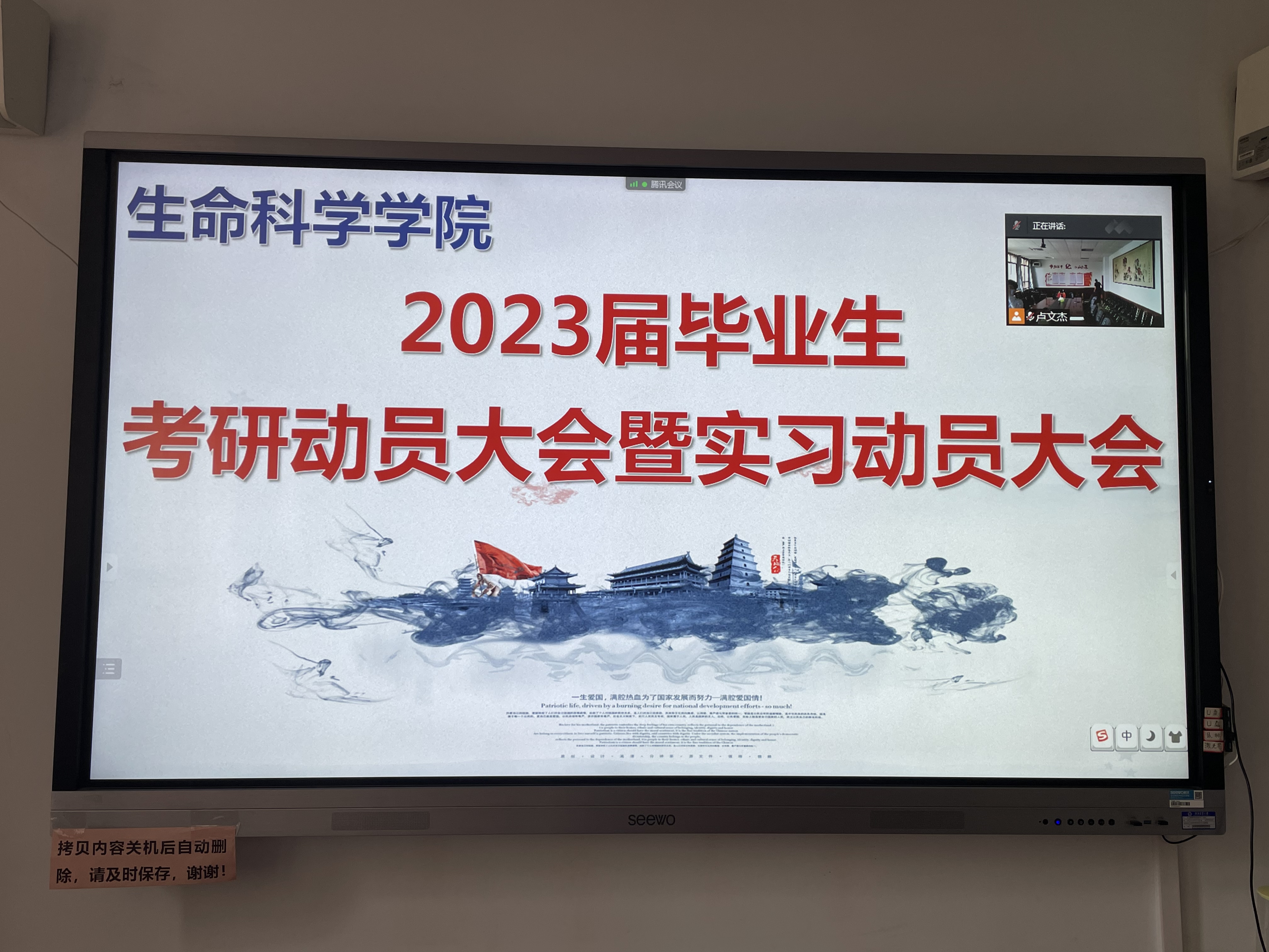 接着,陈明明分析了当前毕业生发展的严峻形势,从院校选择、专业指标、个人实力、未来发展等方面进行总结,强调考研和就业的重要意义,提出a小说 考研助力计划,鼓励同学们立志高远、瞄准目标、全力拼搏。陈明明特别提醒学生注意疫情下的个人防护,提高防骗意识,谨防网络诈骗。会议最后,刘展针对学生就业选择方向、就业心态、职业规划等进行分析,提醒学生要确定自身优势、认清形势、乘势而上、顺势而为,号召同学们坚定信心,充分利用好个人空余时间,不畏艰难和挑战,不断挖掘自身潜能,为毕业做好准备。