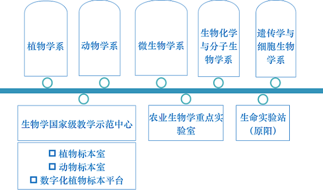 学院现设植物学、动物学、微生物学、生物化学与分子生物学、遗传与细胞生物学5个系和1个国家级生物学实验教学示范中心;有生物学河南省一级重点学科(涵盖11个二级重点学科);有生物科学(一本)、生物技术(一本)、生物工程(一本)等三个本科专业;其中生物工程专业获批国家级一流本科专业建设点、河南省高等学校专业综合改革试点专业,入选教育部首批“拔尖创新型”卓越农林人才培养模式改革项目;生物技术专业获批河南省一流本科专业建设点,是河南省特色专业、河南省高等学校专业综合改革试点专业;生物科学专业获批河南省一流本科专业建设点。本科生1417人,研究生413人(包括博士32人)。
